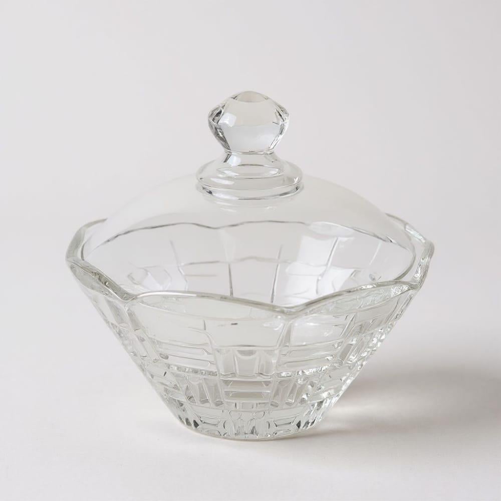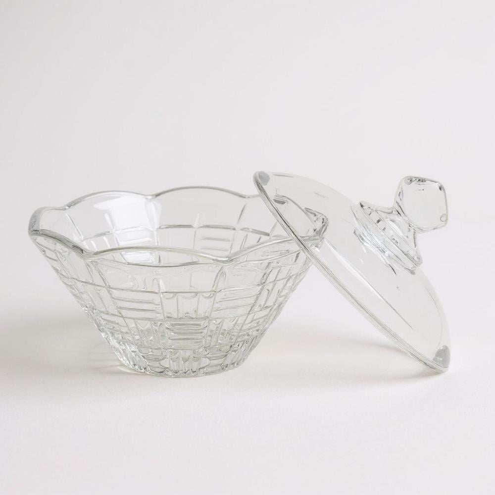 صحن تقديم فاخر مصنوع من الزجاج الشفاف، مزوّد بغطاء قبة مزخرف بنقشة خطية أنيقة ومقبض علوي لسهولة الاستخدام.يتميز بفتحة علوية بقطر 17 سم، وقاعدة مستقرة ...